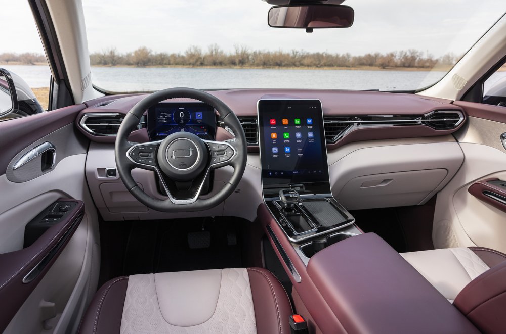 Кое-что в салоне напоминает о его невысокой цене. Впрочем, Bestune T90 старательно пытается скрыть экономию. Кому-то в глаза бросятся толстые рамки экрана (если вы пересели из Тойоты, то не заметите их, но после Jaecoo J7 не впечатлитесь) и в целом отсутствие каких-то запоминающихся решений в интерьере. Но дизайнеры не собирались так просто сдаваться. Сочетание темно-вишневого цвета с бежевым делает салон из недорогих материалов богаче и уютнее. Пластик в цвет кожи — отличная идея.